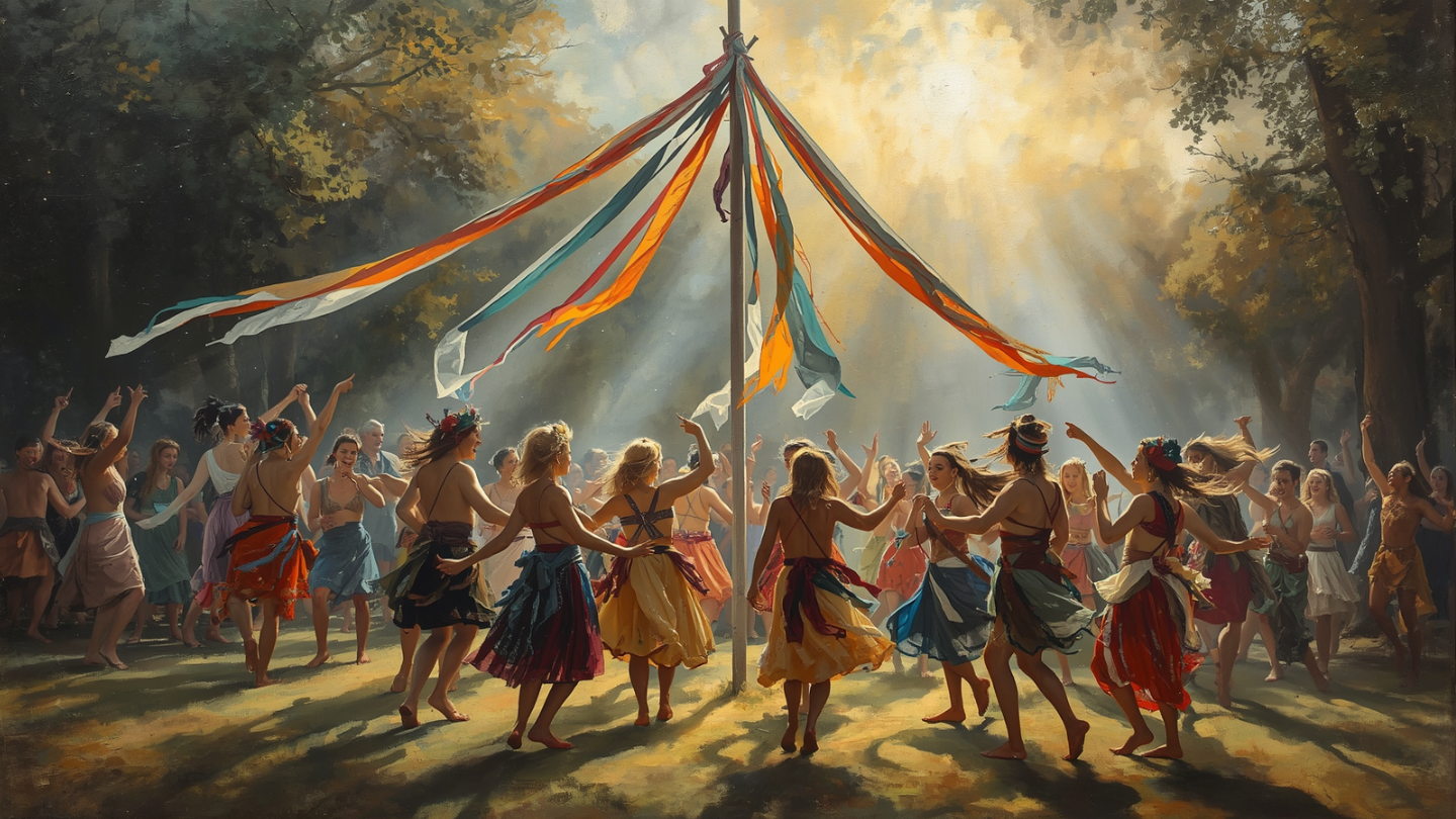 Un altro simbolo potentissimo di questa festa, giunto fino a noi, è il Palo di Maggio (spesso ricavato dal legno di Biancospino), attorno al quale i giovani danzavano intrecciando nastri colorati. Questo antico rito rappresenta l'Ierogamia, ovvero l'Unione Sacra tra il Dio (il principio maschile, solare, eretto e attivo) e la Dea (il principio femminile, terroso, ricettivo e circolare). Una fusione cosmica di opposti necessaria per generare nuova energia.